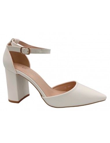 Γυναικεία γόβα σε άσπρο χρώμα . Δένει στον αστράγαλο. Διαθέτει ντυμένο τακούνι. Μια κομψή και άνετη επιλογή